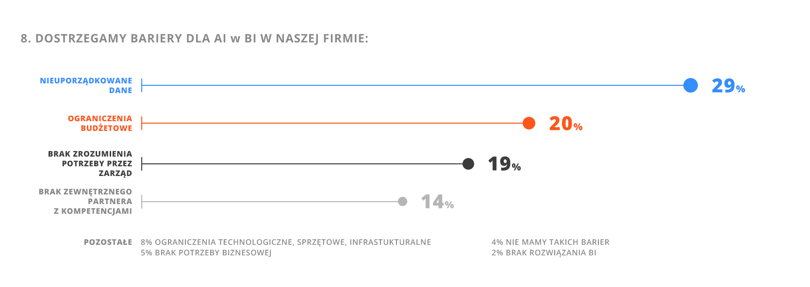 Ankietowani pytani o bariery jakie dostrzegają w swoich firmach dla wykorzystania AI w BI wskazywali najczęściej na trzy elementy: nieuporządkowane dane w firmie (29%), ograniczenia budżetowe (20%) oraz brak zrozumienia potrzeby wśród kierownictwa firmy (19%).