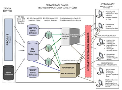 Narzędzia do analiz i raportowania (13 licencji): ProClarity Analytics Server 6.2 wraz z ProClarity Web Professional 6 do analiz wielowymiarowych, pulpit menadżerski ProClarity Dashboard Server 6.2, MS SQL Server 2005 Reporting Services do raportowania.
