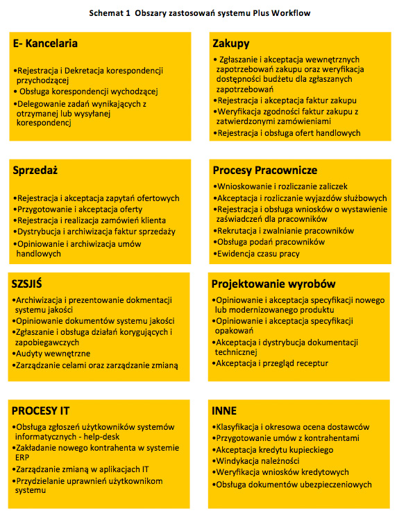 Pomimo faktu, że system Plus Workflow najczęściej jest wykorzystywany jako narzędzie pozwalające na akceptację zapotrzebowań zakupu, faktur zakupu czy archiwizację faktur sprzedaży to również z powodzeniem wspiera procesy produkcyjne, procesy wynikające ze standardów systemów zarządzania jakością czy procesy kadrowe. Jego dodatkowym atutem jest możliwość integracji z dowolnym system klasy ERP takim jak np. SAP, IFS, OPTIMA, CDN XL, Symfonia, QAD, Navision itp.