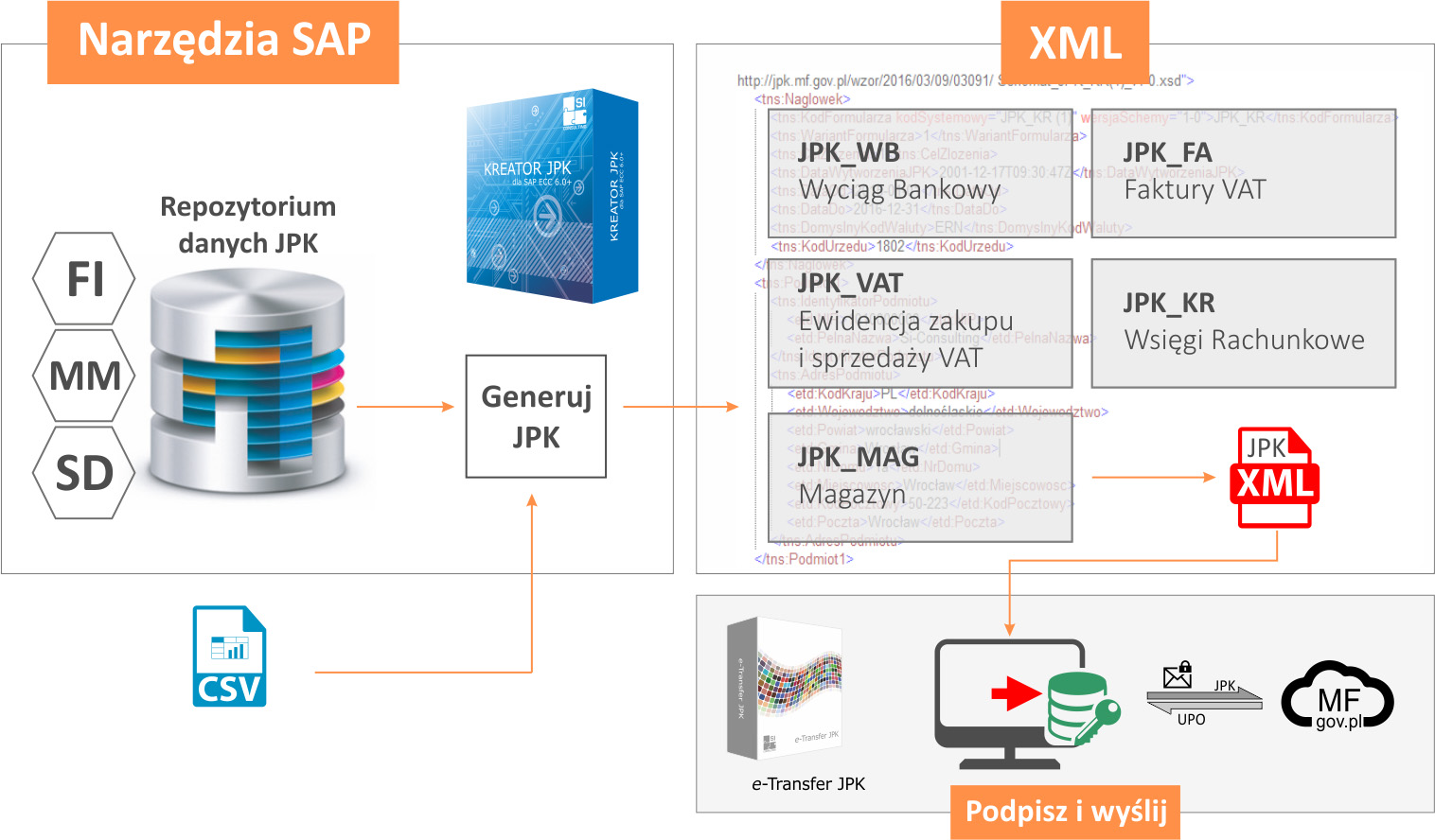 Proces przygotowania plików JPK polega na pobraniu danych bezpośrednio ze źródeł w systemie ERP lub z systemów zewnętrznych – poprzez pliki CSV. Następnie, na podstawie zebranych danych, generowane są pliki XML. W kolejnym kroku, dzięki modułowi e-Transfer, możliwe jest szybkie i bezpieczne przekazanie danych do organów podatkowych. Całość obsługiwana jest poprzez intuicyjny Kokpit e-kontroli, pozwalający na wygodne grupowanie i zarządzanie zadaniami zbierania danych, tworzenia plików JPK oraz kontroli statusów i postępu.