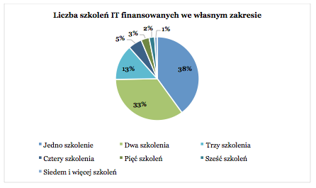 Spośród pracowników działów IT, 31% deklaruje, iż w ostatnim roku uczestniczyło w co najmniej jednym szkoleniu IT finansowanym przez pracodawcę. 65% specjalistów uczestniczyło w jednym lub dwóch tego typu szkoleniach..