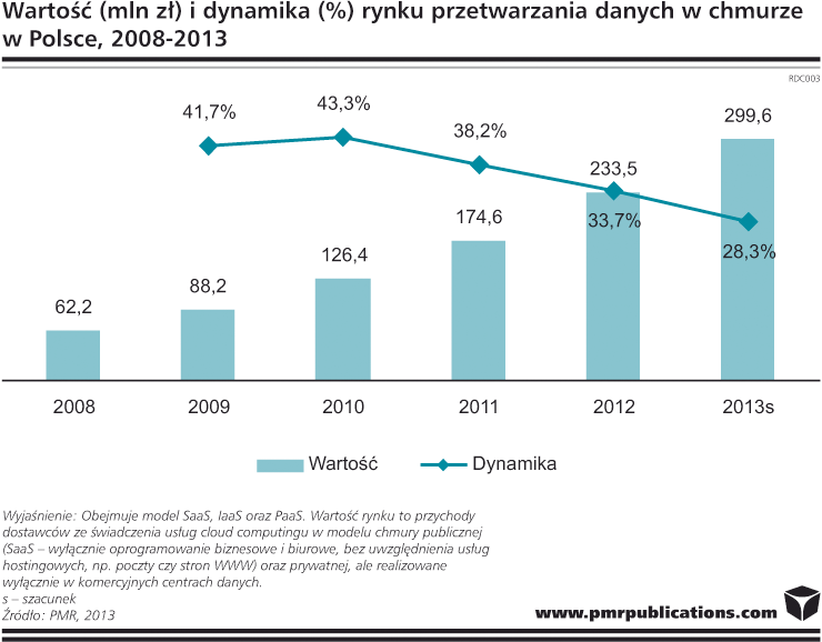 Według najnowszego raportu PMR "Rynek przetwarzania danych w chmurze w Polsce 2013. Prognozy rozwoju na lata 2013-2017", wartość rynku cloud computingu w Polsce, obejmującego zarówno usługi wdrażane w modelu chmury prywatnej, jak i publicznej w 2012 r. wyniosła 234 mln zł. Rynek ten odznacza się wysoką dynamiką wzrostową, z roku na rok przekraczającą poziom 30%. Pomimo znacznych różnic w modelu wdrożenia oraz dostarczania technologii i poziomu jej adopcji przez firmy duże oraz małe i średnie, można nadal uznać, że jest to rynek młody. Przekłada się to, jak wspomniano, na wysoką dynamikę. W rezultacie, w 2013 r. rynek osiągnie wartość 300 mln zł.